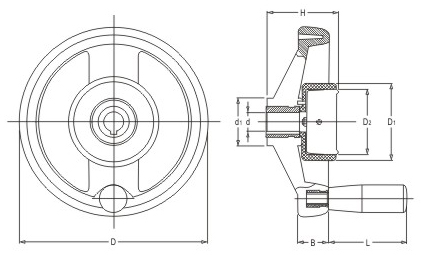 JS.105006 雙輻表盤手輪 顏色:黑色 材質(zhì):酚醛樹脂(膠木)、鋁合金 用途:適用于木工、食品、包裝、印刷等機(jī)械的精密指示或讀數(shù)調(diào)節(jié) 特性:外形美觀、堅(jiān)固耐用、機(jī)械式結(jié)構(gòu)、