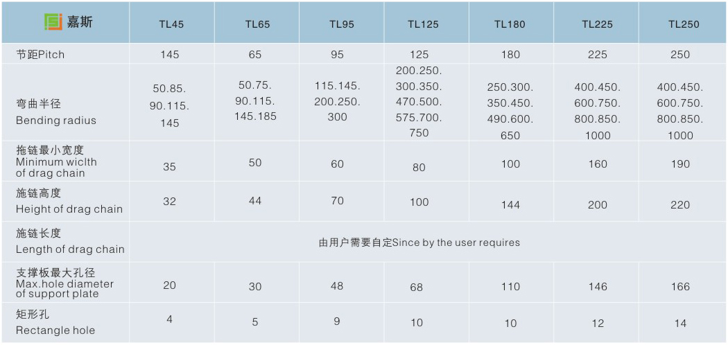 JS.106005 TL型鋼制拖鏈 Tl系列拖鏈的主體是由鏈板(優(yōu)質(zhì)鋼板鍍鉻)支撐板(擠拉鋁合金)軸銷(合金鋼)等部件組成,使電纜或橡膠管與拖鏈之間不產(chǎn)生相對運動,不產(chǎn)生扭曲變形,鏈板經(jīng)鍍鉻處理外形效果新穎,結(jié)構(gòu)合理,靈巧強度高,鋼性好不變形,安裝方便,使用可靠,易拆裝,尤其是本產(chǎn)品采用了高強度耐磨材料,合金銅為軸銷,提高了產(chǎn)品的耐磨強度,彎曲更靈活,阻力更小,降低了噪音,從而可保證長時間使用不變形,不下垂。 由于本產(chǎn)品外觀精美,可在較大程度上增強機床設(shè)備的整體藝術(shù)美觀效果,增強我國機床、機械設(shè)備在市場的競爭能力。 1.拖鏈可適應移動速度40米/分。 2.拖鏈在移動速度時,噪聲聲壓級不大于68分貝。 3.拖鏈安全使用壽命不小于100萬次(往復)。