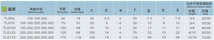 JS.106006 TLG型鋼制拖鏈 TLG型鋼制拖鏈可承載數(shù)量多,重量大的電纜及油管,自由懸置(允許不用支承輪)長度大,支撐板可依顧客需要制作,適用于工作母機(jī),移動機(jī)械等。其彎曲半徑為50-600mm,鏈板高度為35-150mm,可任意使用。 TLG型鋼制拖鏈其使用行程較大為32米。適用于所有傳動方式?呻S意加長和縮短。此外,可通過改變銷軸獲得改變彎曲半徑。 拖鏈的支撐板寬度為150mm至600mm,孔與孔之間的間隔量為5mm。 鏈板的高度,也就是支撐板的高度,是由電纜較大直徑?jīng)Q定的,機(jī)床較大限度運(yùn)轉(zhuǎn)時,如拖鏈的寬度超過300mm,拖鏈的長度超過4m時出于穩(wěn)定性原因,應(yīng)考慮選擇加大一號規(guī)格的拖鏈。 彎曲半徑要根據(jù)電纜的較大直徑選擇并應(yīng)達(dá)到電纜直徑的10倍。彎曲半徑可根據(jù)所給表格選擇50-600mm,行程小的可相應(yīng)選擇較小的半徑。 拖鏈的長=1/2行程+4個彎曲半徑,這只適用于當(dāng)固定聯(lián)結(jié)是在行程的中點(diǎn)時。 拖鏈的固定可根據(jù)機(jī)床的位置情況選擇。固定角鋼可放在外圍或內(nèi)周的拖鏈內(nèi)或外部,一般情況聯(lián)結(jié)部分在拖鏈內(nèi),而向外周。
